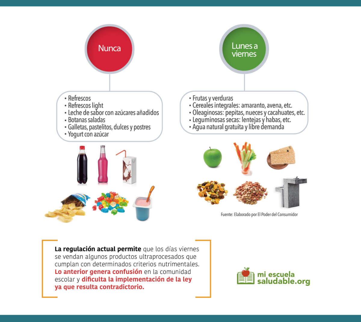 Esta ley prohíbe la venta de comida chatarra por lo que SOLO se deben ofrecer alimentos naturales como frutas, verduras, cereales integrales, semillas, leguminosas secas y agua simple a libre demanda.